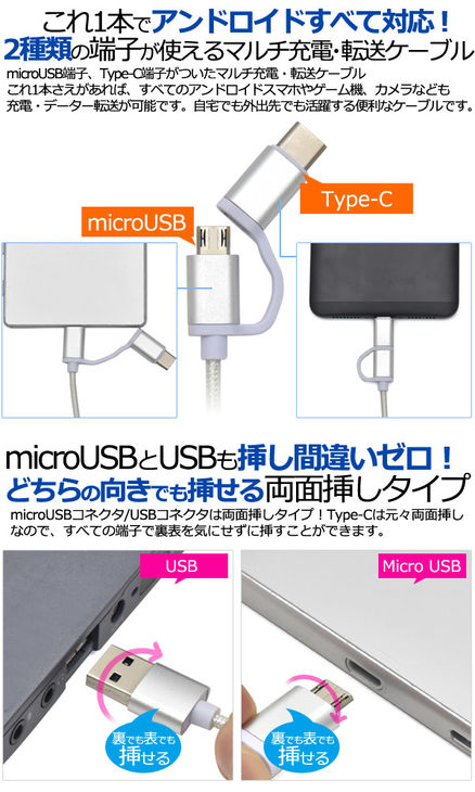 これ1本アンドロイドすべて対応!しかもどちらの向きでも挿せる両面挿しタイプ! microUSB+Type-C マルチ充電・転送USBケーブル 1m(100cm) microUSB、Type-C端子がついたマルチ充電・転送USBケーブル これ1本さえがあれば、すべてのアンドロイドスマホ、Nintendo Switchやデジカメ、アイコスなども 充電・データー転送が可能です。