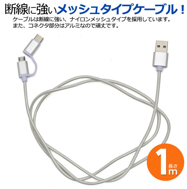 【microUSB-Type-C充電・転送USBケーブル1m/メッシュタイプ100cmタイプ】データ転送 データ通信 microUSB端子 マイクロUSB アンドロイド 両面挿し 表裏 ゲーム機 デジカメ タブレット Xperia Nintendo Switch デジカメ アイコス シルバーカラー